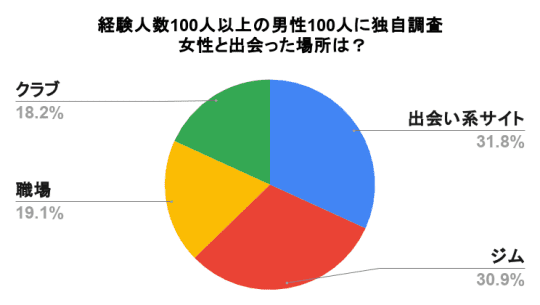 このグラフの結果を見ても分かるように、ジムで女性と出会っている男性は3割!なんと3人に1人がジムで女性と出会っているのです!意外でしょ?