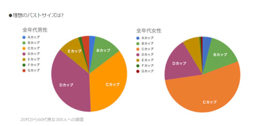 男性で最も人気の高い理想のバストサイズはDカップで全体の36.7%。次いでCカップも34.7%という僅差で人気でした。C・Dカップで男性全体の7割以上の人気を集めています。女性で最も人気が高かったのはCカップで53.3%。約半数の女性が「理想のサイズ」としてCカップと答えています。続いてDカップの18.8%、Bカップの15.3%。9割近い女性がCカップ前後を理想と考えている結果となりました。