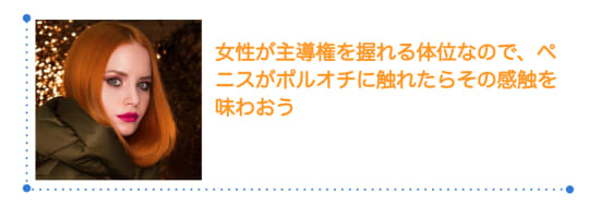 女性が自ら動いて角度を調整したり、男性に腰を動かしてもらうと奥まで突かれ、Gスポットやポルオチの性感帯に上手く当たりますよ。