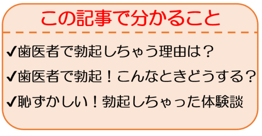 歯医者で勃起した経験はありませんか?歯医者で勃起なんて…と思うかもしれませんが勃起する人は案外と多いと聞きます。若くて綺麗な歯科衛生士や助手さんの体が近づくとドキドキ。我慢できずアソコが元気になってしまうのです。今回は歯医者で勃起する理由や対処法を紹介します。