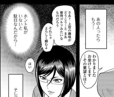 接待ゴルフかなんかだろうと思いつつ、指定された旅館に向かったカホであったが、そこで待っていたのは甲斐と見知らぬ男、そして取引先会社の会長であった。