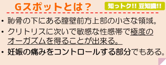 Gスポットとは、膣内に指を挿れた状態で間接を曲げた上側に当たる部分のことです。ちょうど尿道の裏側に位置するため、Gスポットを刺激することが潮吹きでは重要になります。