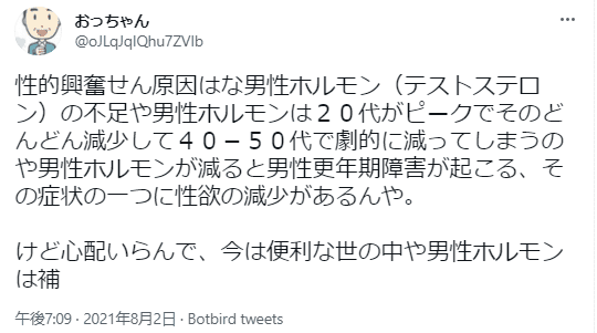 最近問題視されてるのはLOH症候群という症状。男性ホルモンの中に含まれてるテストステロンの配給が減少するために起こることで、性欲の減退やうつ病を引き起こしたりのやっかいな症候群。