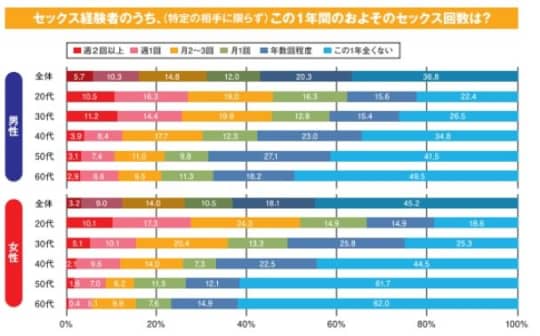 このデータによると1年間セックスを全くしてないや年に数回が男女とも約7割。女性に至っては1年セックスレスが6割越えとか。