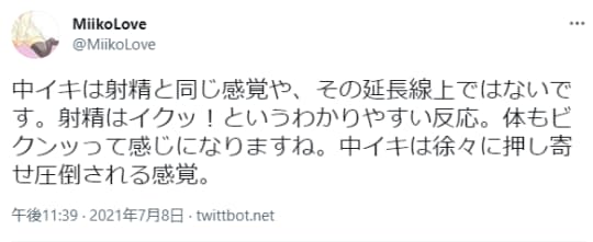 中イキはおしっこをする時の感覚になるから、初心者はおしっこと勘違いして辞めてしまう子多いけど、その感覚を我慢して刺激し続けると凄い快感を得られる!(28歳・介護士)
