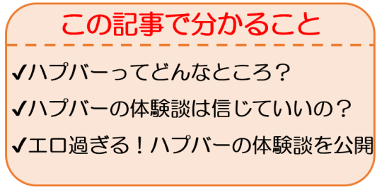 ハプバーの体験談。過激すぎるものやAVっぽいプレイについても紹介されているので、読んでいても「嘘じゃないの…?」「ほんとにこんなことできるの…?」と思ってしまうこともあるでしょう。筆者も、ハプバーに初めて行くまでは半信半疑で読んでいました(笑)