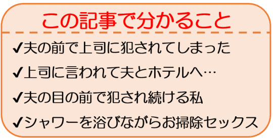 その後は夫の存在など無く二人の時間を楽しむかのように、体位を変える度にイかされ、最後は正常位で「そろそろイくよ」と最高速のピストンに、一緒にイッてしまい「6回もイッたね。そんなに、このチンチン気持ち良かったの?奥さんも最高だったよ」と、上司はシャワーを浴びると「宿泊代は払っておくから、二人も楽しんでいって」と帰って行きました。