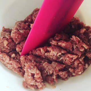 これらをひき肉と混ぜて、ゴムベラなどで切るように混ぜていきます。