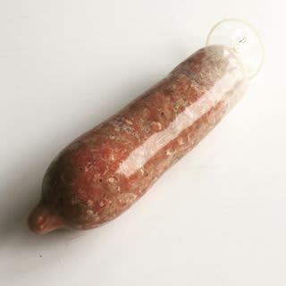 ソーセージとは別名「腸詰」、つまり、羊などの動物の腸にひき肉やスパイスを詰めて作られているため、コンドームが腸の代用品になると言うわけです。