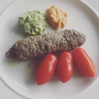 今回は、ソーセージとおんなじチンコ型のミニトマトを添えて、ひよこ豆のペーストとアボカドのペーストでいただきました。
