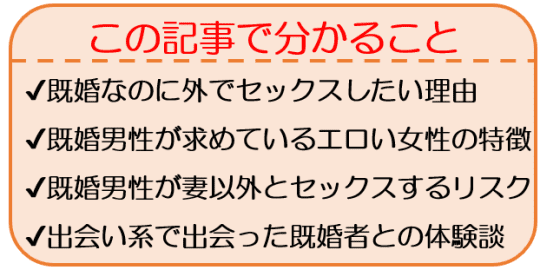 既婚になっても男性のエロさは変わりません。持て余している性欲や性癖を発散したいが故にセフレに出来そうな女性をいつも探しています。風俗やソープ以外で好むエロい女性の特徴や、実際に結婚している男性とのセックス体験を公開します。