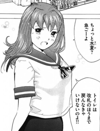 おしっこが漏れそうだと、焦る水夏。階段を降りるのもツライ。そんな時に思い付いたのは・・・手すりを滑り降りる!しかし、股に食い込む手すり。逆に刺激しているような・・・?