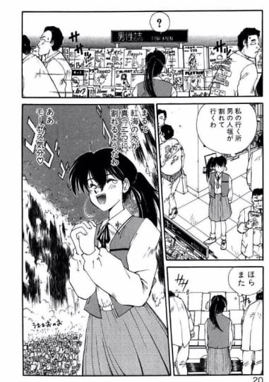 まずはエッチな本を参考にするため本屋に到着し男性誌コーナーへ行くと、エッチな本を読んでいる男性達が離れていくのに感動しつつもSM漫画を手に取るのです。