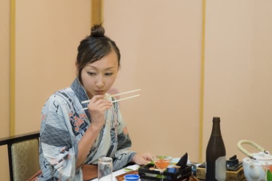 お食事処などで座る際には椅子でも座敷でも、足を崩して座り、少し浴衣の裾をはだけてみましょう。膝上くらいが見える程度がベスト。