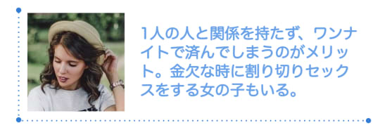 長く1人の人と関係を持たず、ワンナイトで済んでしまうのがメリットでもあるので、金欠な時に割り切りセックスをする女の子もいます。