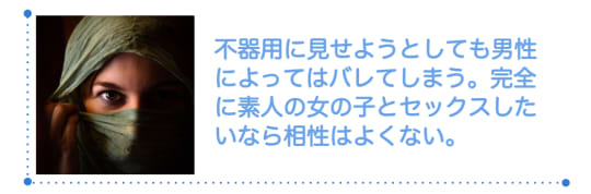 逆に不器用に見せようとしても男性によってはバレてしまうので、完全に素人の女の子とセックスしたいなら風俗経験のある女性とは相性はよくありません。