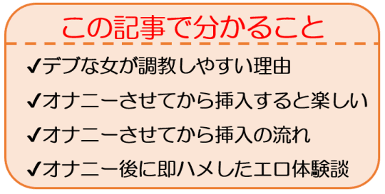 記事の後半では、デブ女にオナニーをさせてから即ハメした体験談も書いていますので、是非最後まで読んでくださいね!