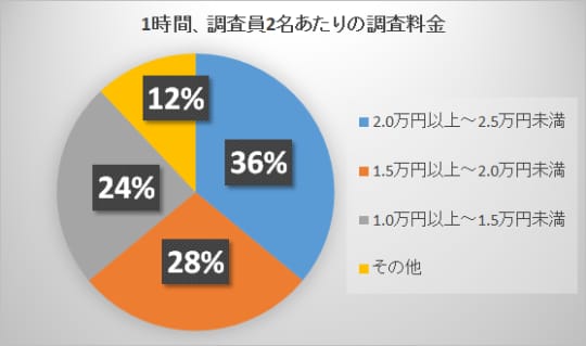参考までに、探偵協会である東京都調査業協会の調査によると、2名の探偵で1時間調査した際に発生する調査料金は1万円から2万5,000円という探偵事務所が約9割を占めるらしいです。