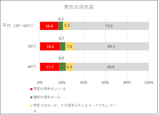 あくまで「今」浮気相手がいるかどうかの割合なので、過去に浮気相手がいた人の割合を増やすと、浮気経験者の割合はこれより増えると予想できます。