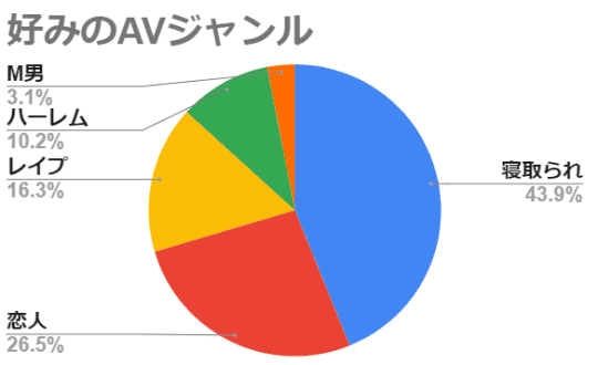 グラフを見てもらえれば分かると思いますが、AVの中で断トツの人気を誇っている寝取られや3つ目のレイプなどの犯罪系ともいえるシチュエーション系のAVが好きな男性が多いことが見て分かることだと思います。