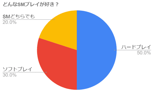 今回のアンケートの結果ハードなプレイは好きな人は5割、ソフトプレイが好きな人は3割、そして1番驚いたのがSMのどちらでもプレイできる人が2割もいたんですね!