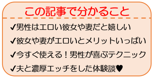 セックスが好きなエロい女性だと男性側が欲求不満になることがないです。欲求不満になることがない=浮気の心配をする必要がないので、男性側だけでなく女性側も安心できます。