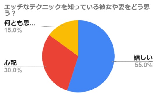 エッチなテクニックを持っている彼女や妻だと半数以上の男性が「嬉しい」と回答しています。しかし、中には「心配」だと答える男性もいるんです。