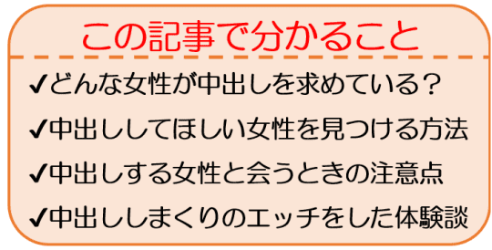世の中には膣内射精を題材にした男性向けの作品が無数にありますが、中出しセックスを希望しているのは女性も同じ。「中出ししてください」という書き込みはネット上にあふれています。このページでは、そんな中出しを希望するエロ女の探し方や特徴などを一挙大公開しちゃいます♡