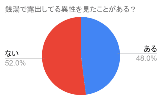 こちらの画像は、Twitterにて集まってくれた20~40代の男女に「銭湯で露出してる異性を見たことがある?」とアンケートを取ったときの結果をグラフに表したもの。