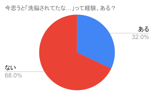 さて、こちらの画像は、Twitterにて集まってくれた20~40代の男女100人に、「今思うと「洗脳されてたな…」って経験、ある?」とアンケートを取ったときの結果をグラフに表したものです。