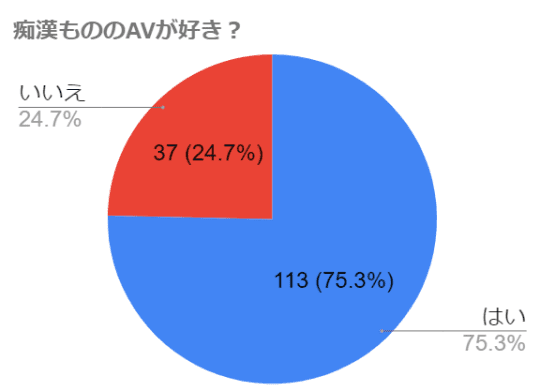 この結果によりますと、全体の7割以上の方が痴漢もののAVを好きと回答しています。