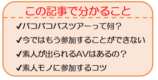 バコバコバスツアーはその代表的な作品とも言え、その参加倍率は100倍以上といえます。今回はそんなバコバコバスツアーの参加方法や、他の素人物のAVの参加方法などをご紹介します。