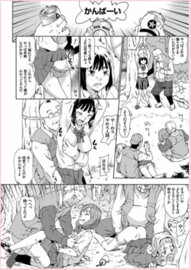 両手を拘束されたJKたちが、長蛇の列を作る村人に犯されていきます。