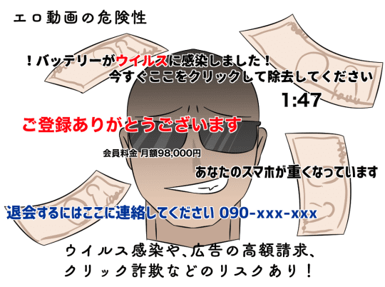 1点だけ注意しておきたのが、稀にワンクリック詐欺へと誘導する広告があります。無視すれば問題ありませんが、若干焦るのでそこだけ注意しましょう。