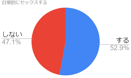 上記は独自調査で100名の女性を対象にアンケートを行った結果です。日常的にセックスしているカップルは半数程度と、半々の割合の結果になりました。