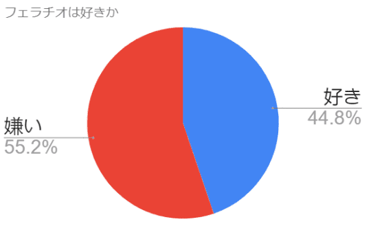 フェラチオが好きか独自の調査で100人の女性に聞いてみました。約45%程度の女性は好きと回答しています。私はフェラは好きな方ではなかったのですが、臭いちんこでない限りフェラは好きです!(笑)