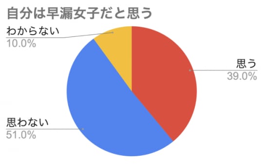 その結果、約40%の女性が”早漏だと思う”と答えました。早漏女子の方は、本人にも早漏の自覚がしっかりとあるようです。