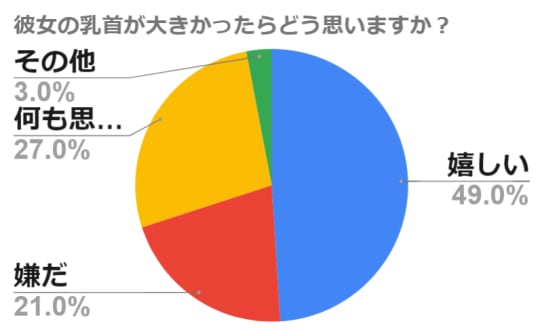 意外に多かったのが、彼女の乳首が大きかったら嬉しいという意見です。最初に紹介した円グラフでも半数の男性が大きい乳首を嬉しいと回答しています。