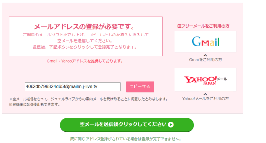 出てきたメールアドレスをコピーして、空メールを送れば、本登録ができるURL付きのメールが返信で来るので、そこにアクセスして、必要事項を記入しましょう。