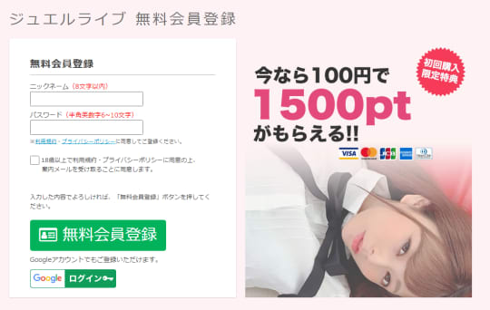 ジュエルライブでは初めて会員登録する人に、100円登録で、1,500円分のポイントを貰えるキャンペーンをしています。