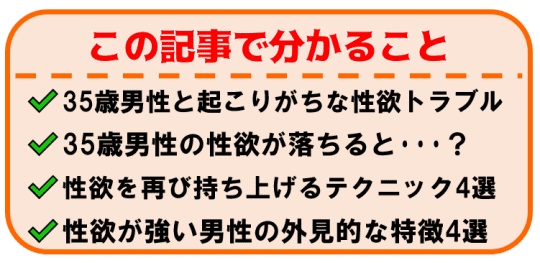 35歳くらいの男性は性欲のピークを越えてしまった人が多く、そのため、パートナーとの性生活が上手くいかなくなってトラブルに陥りがちなのです。