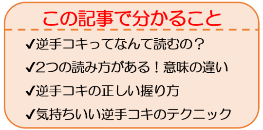 調べて分かったのですが、正確には「ぎゃくてこき」と読みます。そして逆手コキの本当の意味を知る人は、少ないと感じました。
