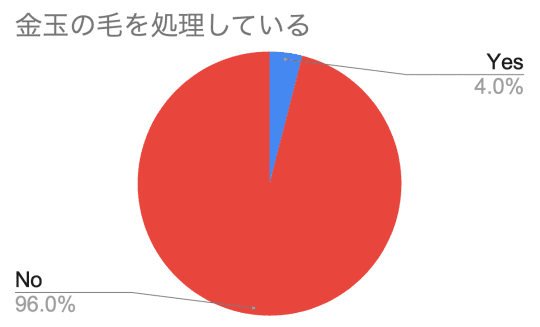あるSNSで20代から30代の男性100人にアンケートを取ったところ、以下のグラフのように、金玉の毛を処理しているのは4%にとどまりました。