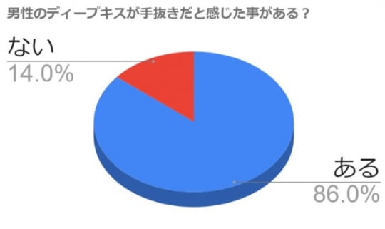 こちらは20代から30代の女性70人に行った、男性のディープキスが手抜きだと感じた事があるかどうかのアンケートです。86%もの女性が、ディープキスに手抜き感を感じた事があるようですね!