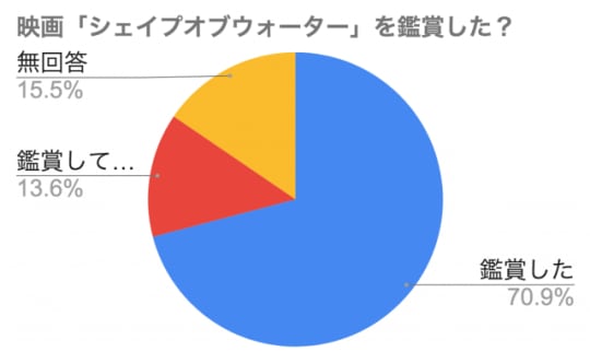 映画好きネットユーザー100名に『映画「シェイプオブウォーター」を鑑賞した?』とアンケートを取ったところ約8割の「78%」の方が「観た」と回答して下さいました。