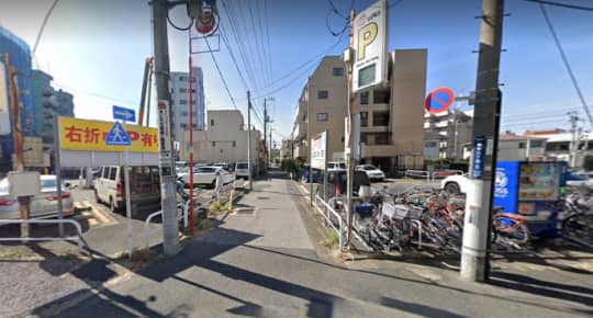 直進すると交差点があり、パーキングの間にある細い道を進みます。