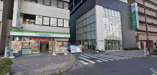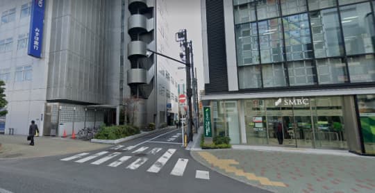 大きな通りに出て右に曲がり、反対車線のファミリーマートとりそな銀行の間を直進します。