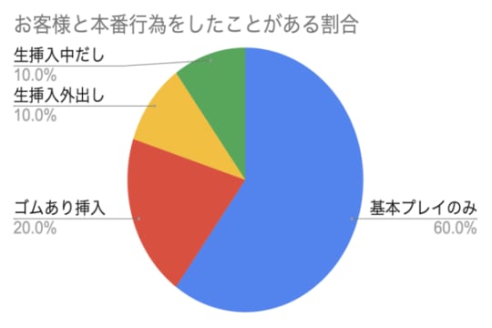 なんと、挿入行為は40%であり、そのうち10%が中出しをしたことがあります。つまり、何回かあなたもデリヘルを利用されれば本番行為ができるチャンスがあるかも!?