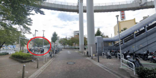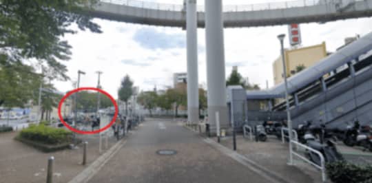 次に画像中央正面突き当りを少し左に歩き、赤丸の道を1本目の十字路まで進んでください。