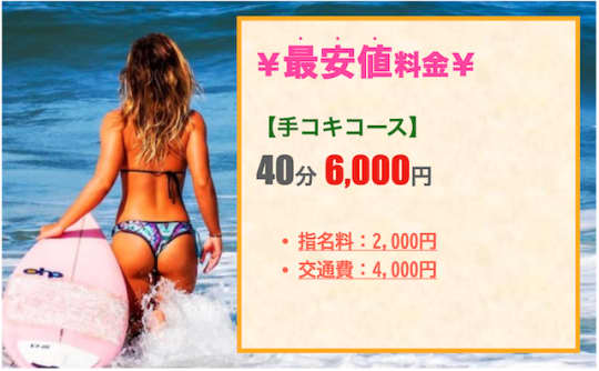 「アクアレアル」の料金システムは、デリヘルコースと手コキコースがある。最安値は、「手コキコース」40分で6,000円だ。オプションでトップレス・ソフトタッチ・オールヌードなどが付加できる。